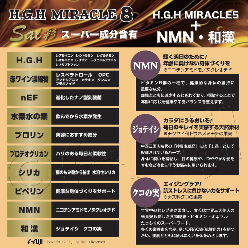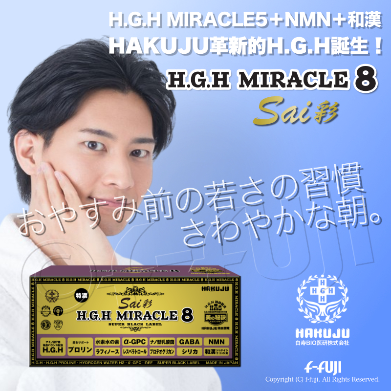 最新発売H.G.H MIRACLE5のグレードアップ版 H.G.H MIRACLE8 Sai彩 ミラクル8 さい 1箱17gX31袋入り MIRACLE5+NMN+和漢 プロテオグリカン配合 白寿BIO医研 HAKUJU HGHの最高峰 高濃度アミノ酸バランス配合 サプリメント ※送料無料・代引手数料無料